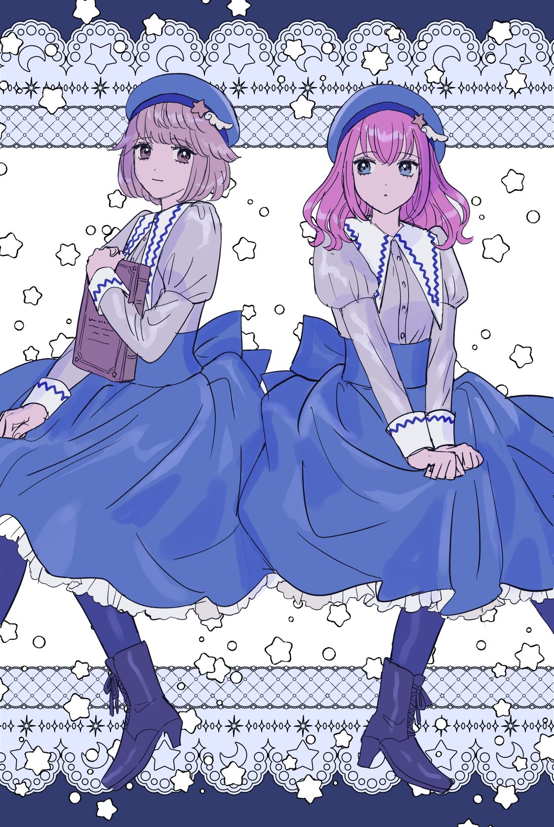 alternate_costume alternate_hair_color ankle_boots back_bow beret blue_background blue_boots blue_eyes blue_hat blue_pantyhose blue_skirt bob_cut book boots border bow brown_eyes clenched_hands closed_mouth collared_dress commentary cool_colored crescent dress foot_out_of_frame frilled_skirt frills grey_background grey_shirt hair_flaps hand_up hat hat_ornament high-waist_skirt high_heel_boots high_heels highres holding holding_book hoshino_(user_ddfw4228) hugging_book hugging_object invisible_chair juliet_sleeves kobato_ryouko lace-up_boots light_smile long_hair long_sleeves looking_at_another looking_to_the_side medium_dress multicolored_dress multiple_girls ornate_border outside_border pantyhose parted_lips partially_bordered pink_hair puffy_sleeves puritan_collar purple_hair shirt shoujo_kageki_revue_starlight shoujo_kageki_revue_starlight_-re_live- sideways_glance sitting skirt star_(symbol) star_hat_ornament star_symbol_background swept_bangs takachiho_stella v_arms white_background wing_hat_ornament